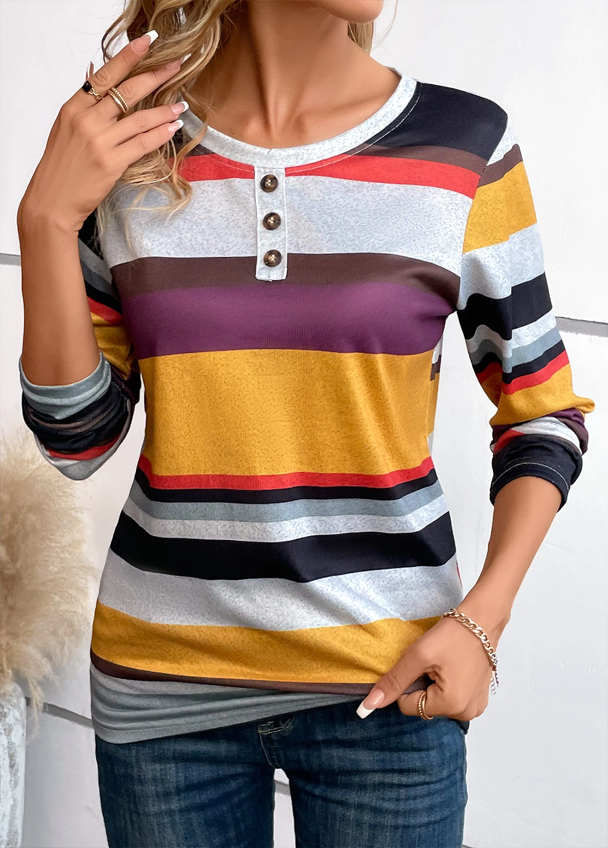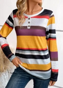 Ginger Button Multi Stripe Print Long Sleeve T Shirt