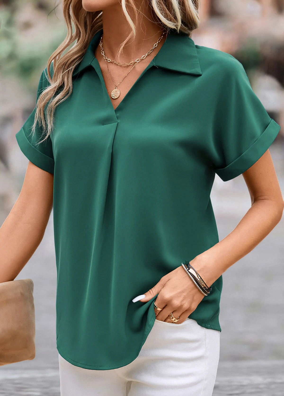 Green Short Sleeve Shirt Collar Blouse