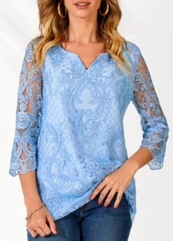 Lace Stitching Split Neck Light Blue Blouse