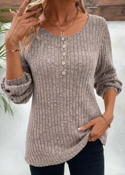 Light Camel Button Long Sleeve Round Neck T Shirt