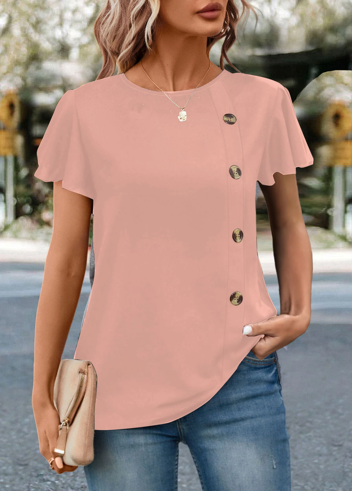 Pink Button Short Sleeve Round Neck T Shirt