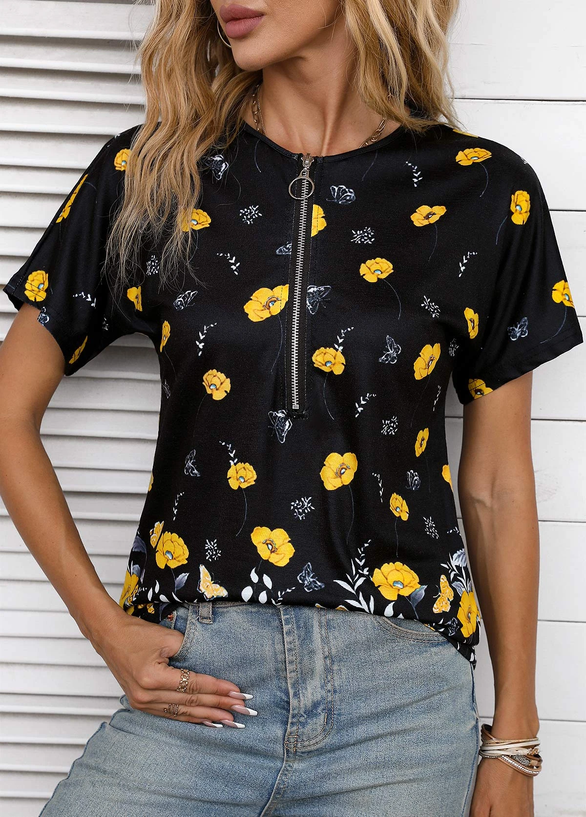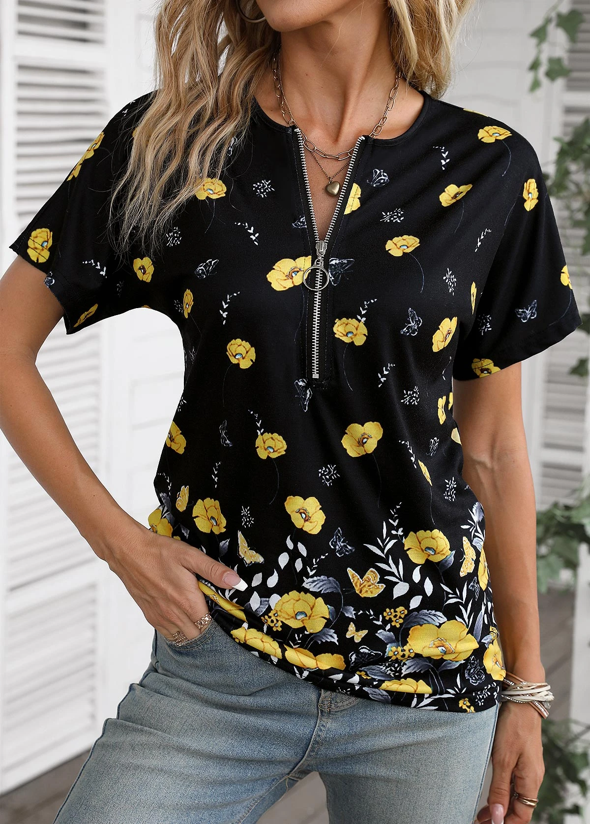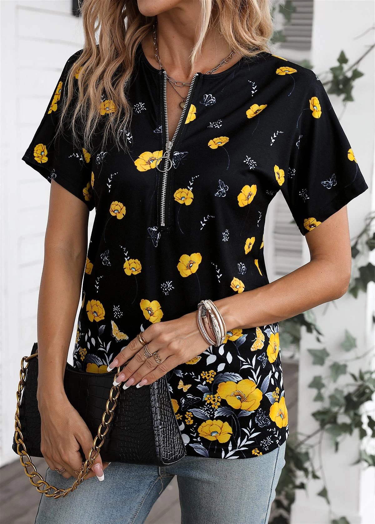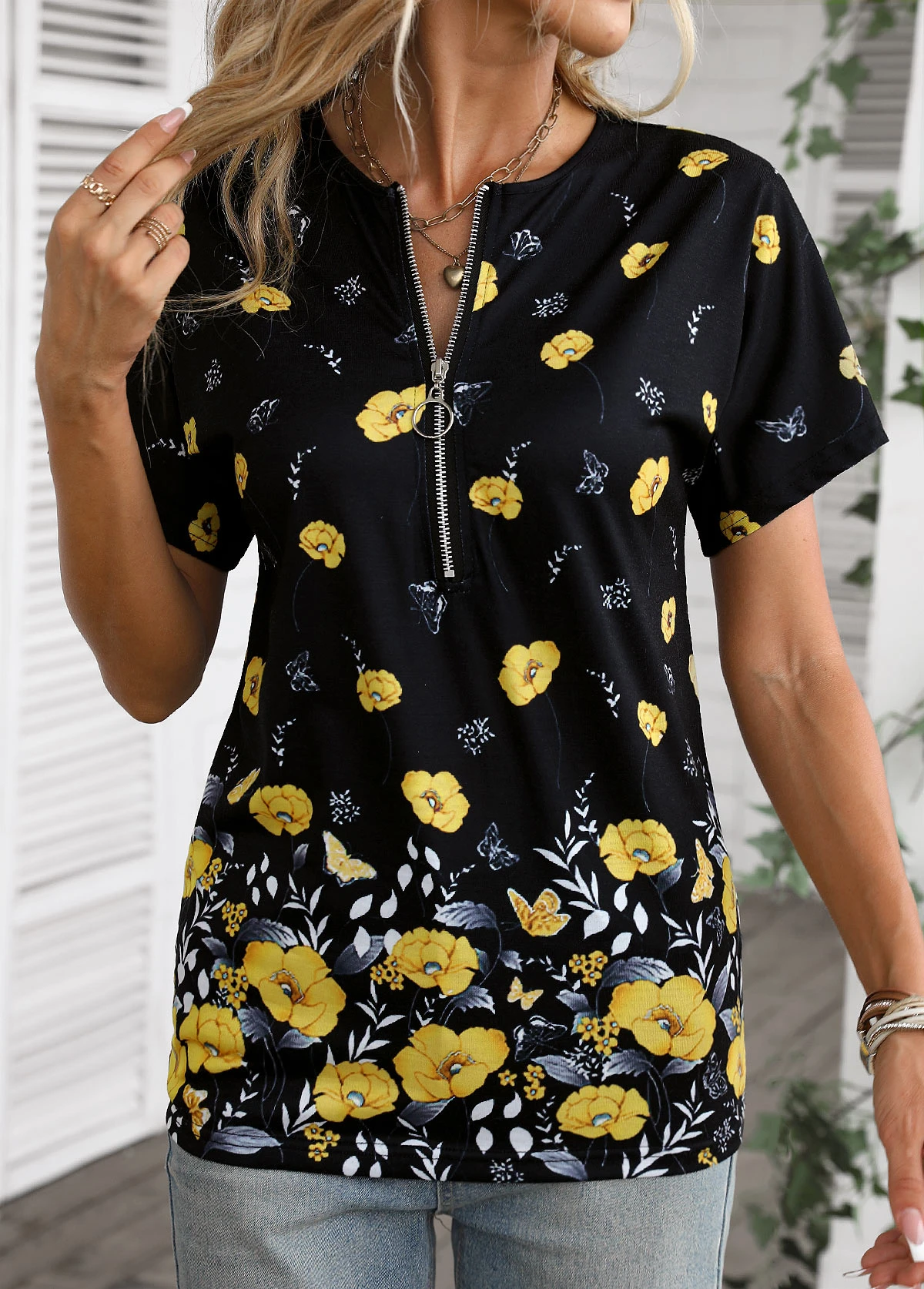 Yellow Zipper Floral Print Short Sleeve T Shirt
